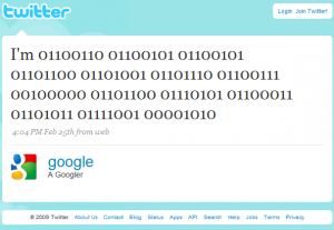 La primera vez que Google utilizó Twitter posteó en código binario: “I’m 01100110 01100101 01100101 01101100 01101001 01101110 01100111 00100000 01101100 01110101 01100011 01101011 01111001 00001010.”, que en pocas palabras significa: “Voy a tener suerte”, igual que el botón que aparece en el buscador.